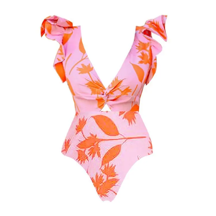 Wholesale 2024 New V-neck Orange Leaf Printed Print One Piece Beachwear Bathing Suit 2PCS Women Vacation Swimsuit and Skirt